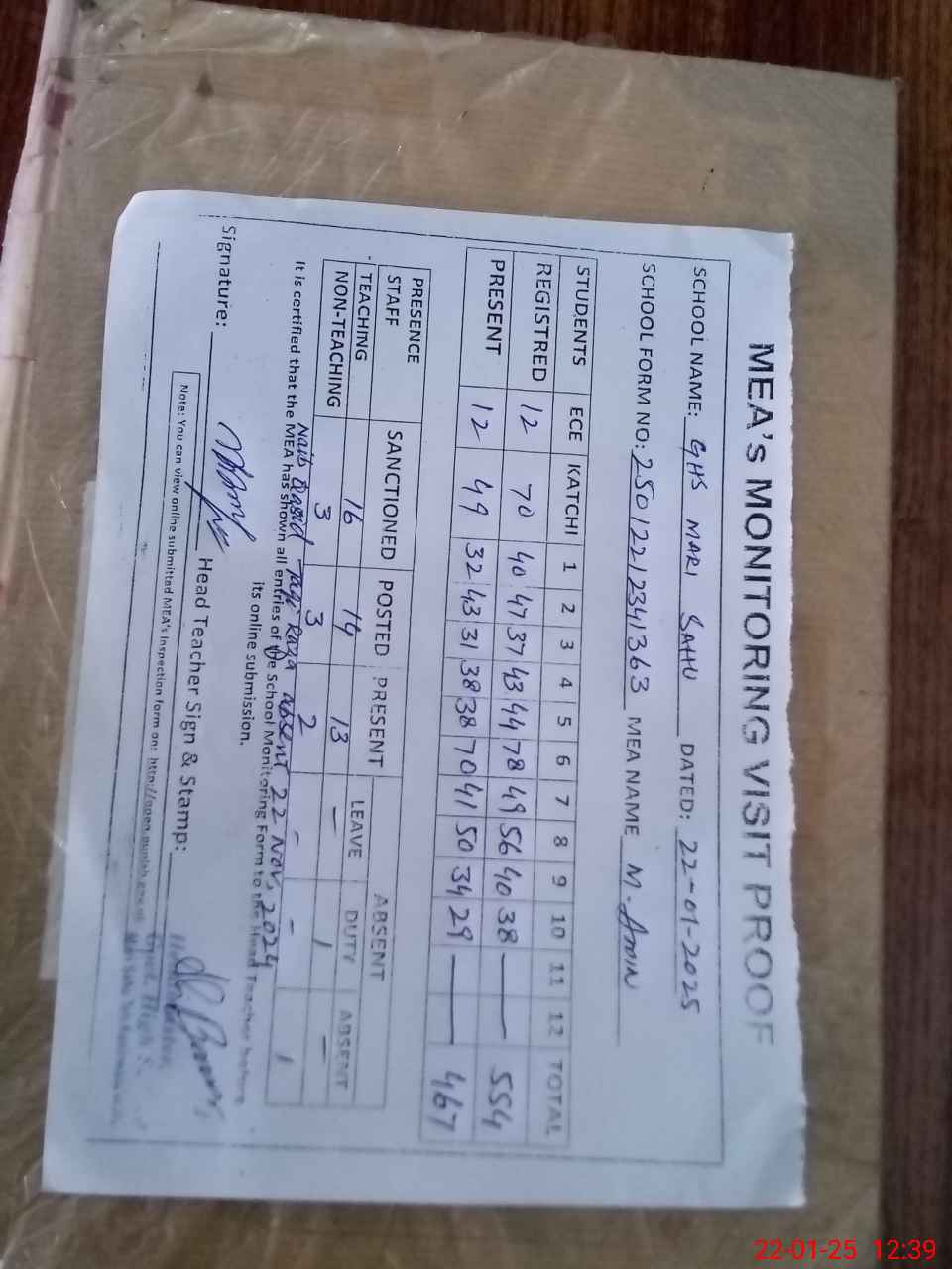 | Attendance Register | Head Teacher | MEA with School | Visit Proof |