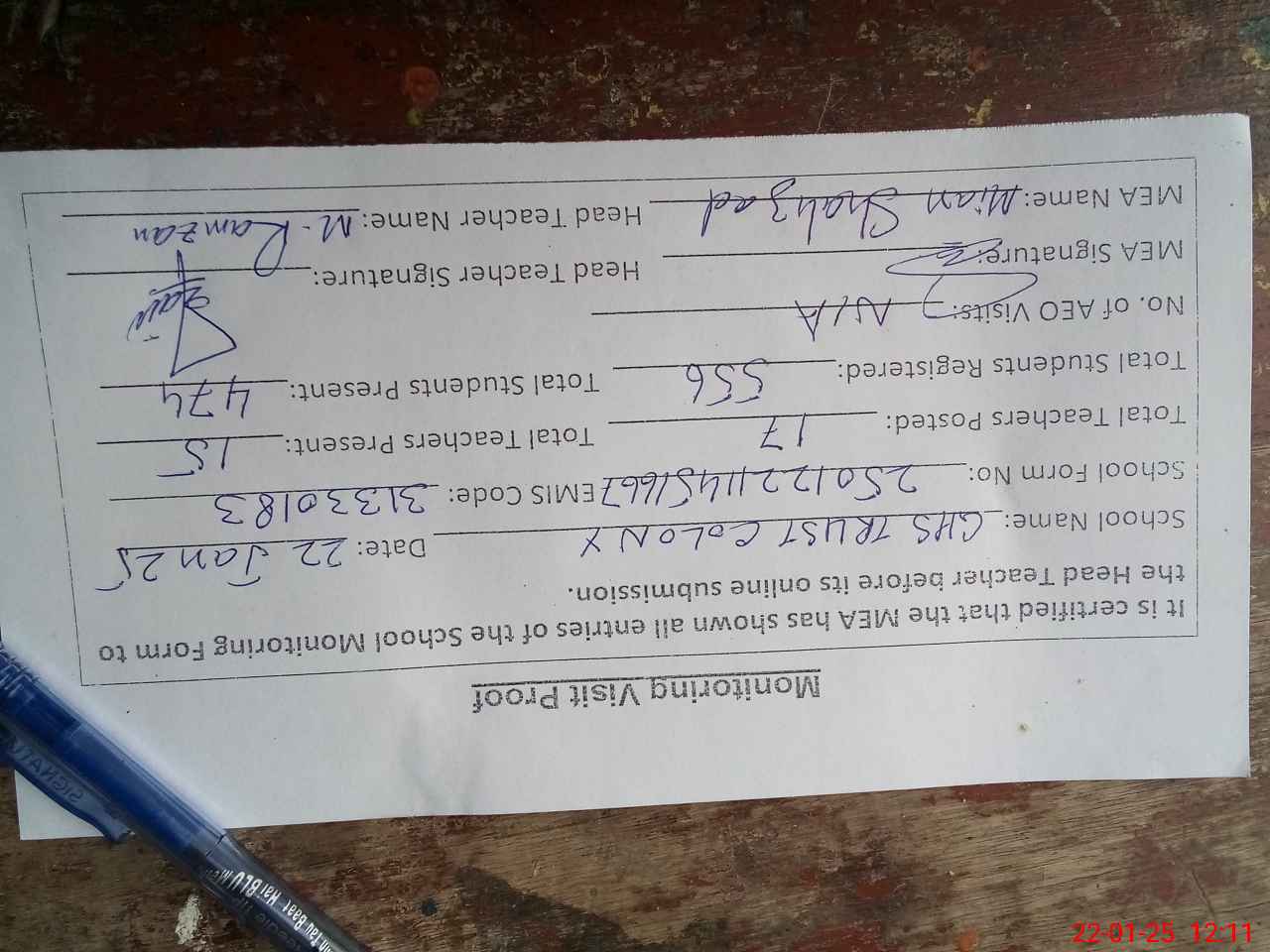 | Attendance Register | Head Teacher | MEA with School | Visit Proof |