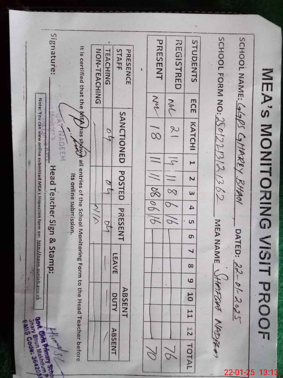 | Attendance Register | Head Teacher | MEA with School | Visit Proof |