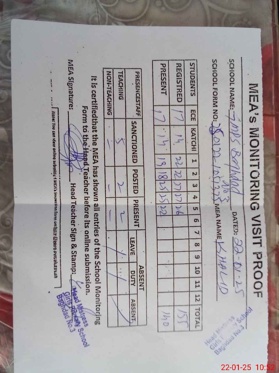 | Attendance Register | Head Teacher | MEA with School | Visit Proof |
