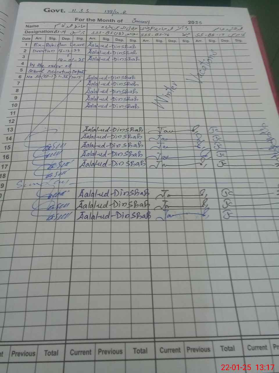 | CNIC | Full Name | Designation | R/C | Absence during last cal. month |