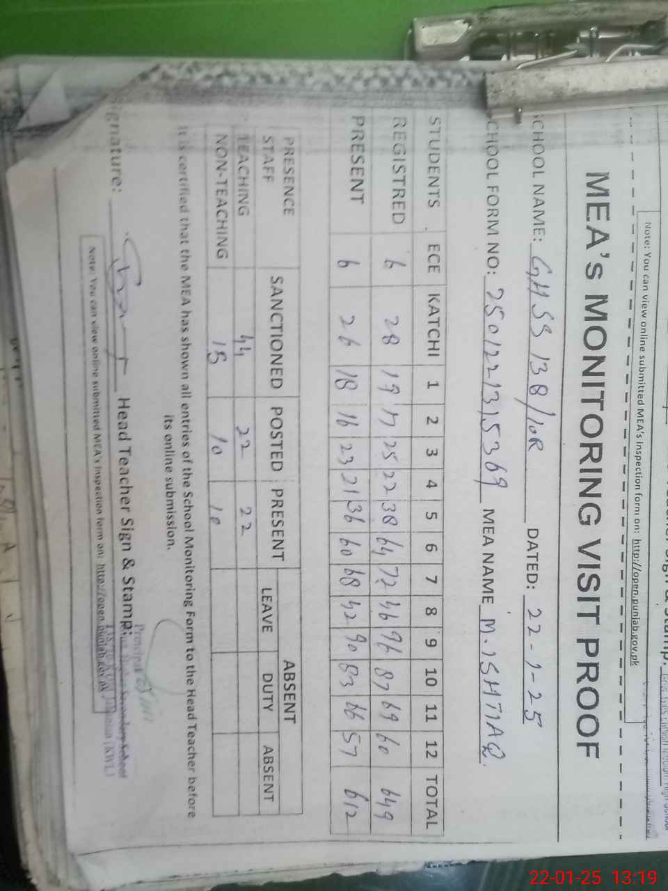 | Attendance Register | Head Teacher | MEA with School | Visit Proof |