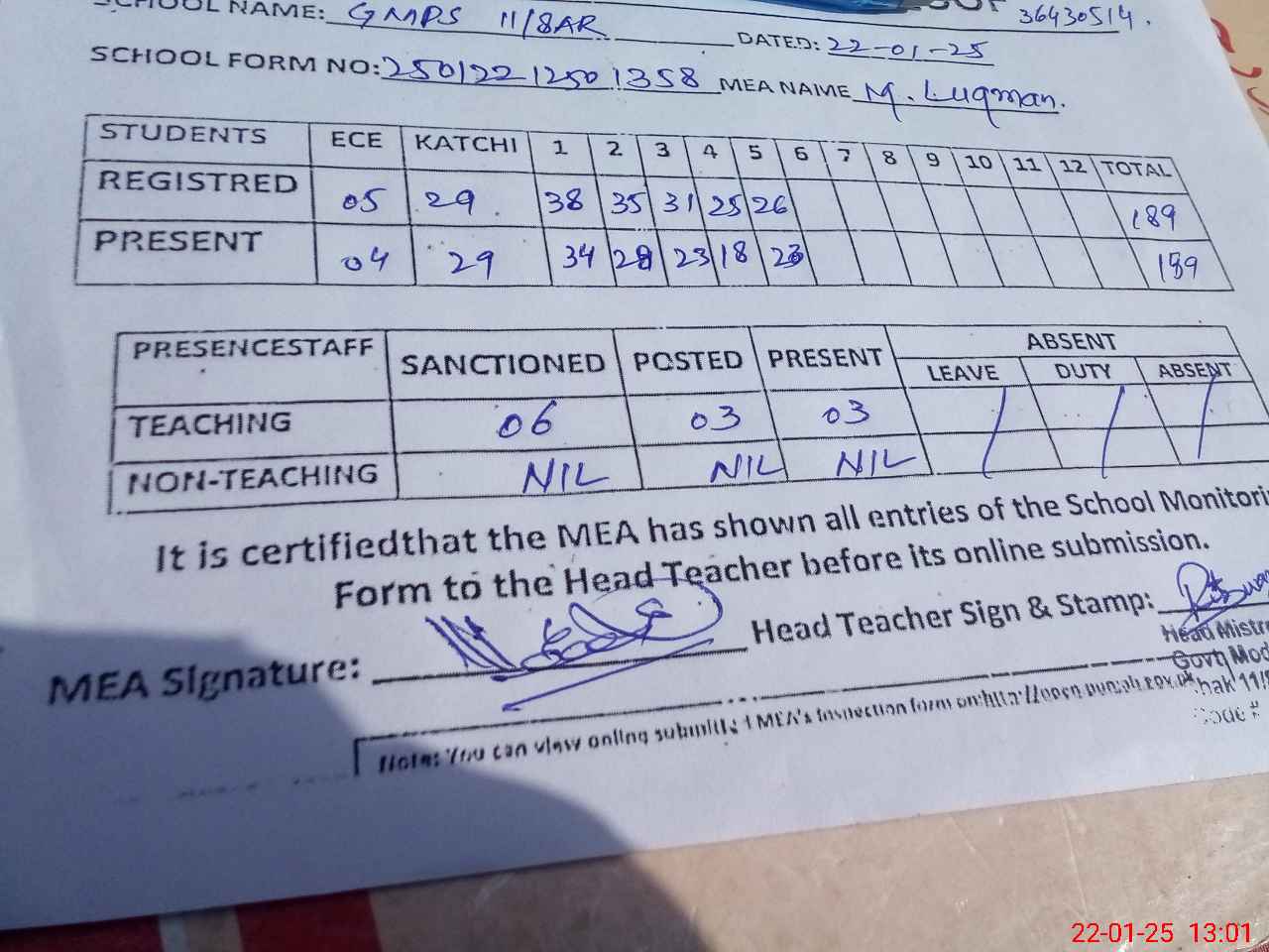 | Attendance Register | Head Teacher | MEA with School | Visit Proof |