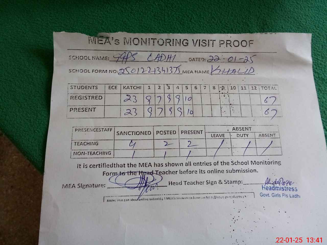 | Attendance Register | Head Teacher | MEA with School | Visit Proof |