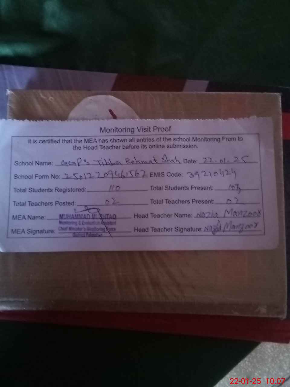 | Attendance Register | Head Teacher | MEA with School | Visit Proof |