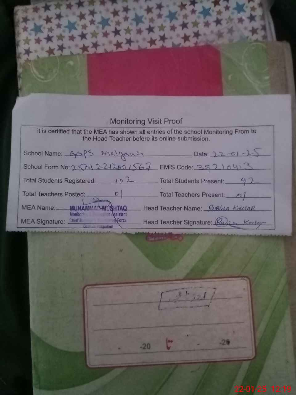| Attendance Register | Head Teacher | MEA with School | Visit Proof |