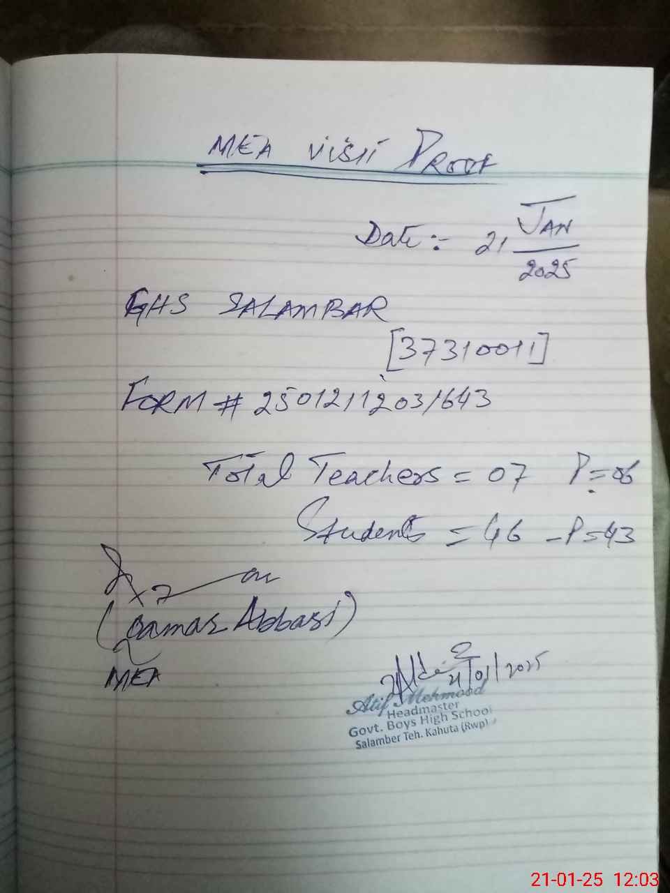 | Attendance Register | Head Teacher | MEA with School | Visit Proof |