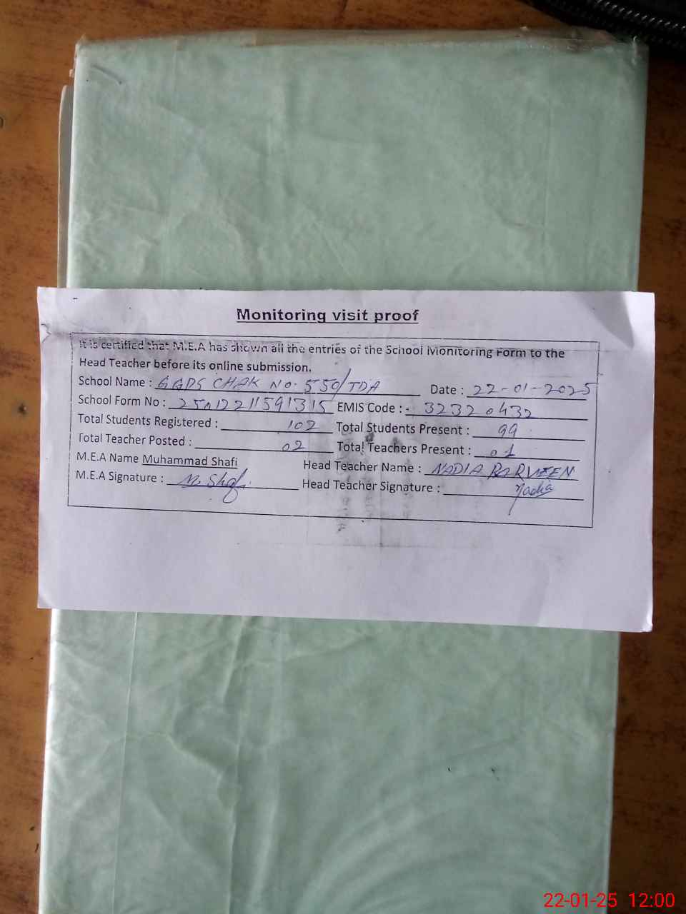 | Attendance Register | Head Teacher | MEA with School | Visit Proof |
