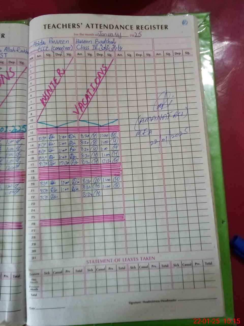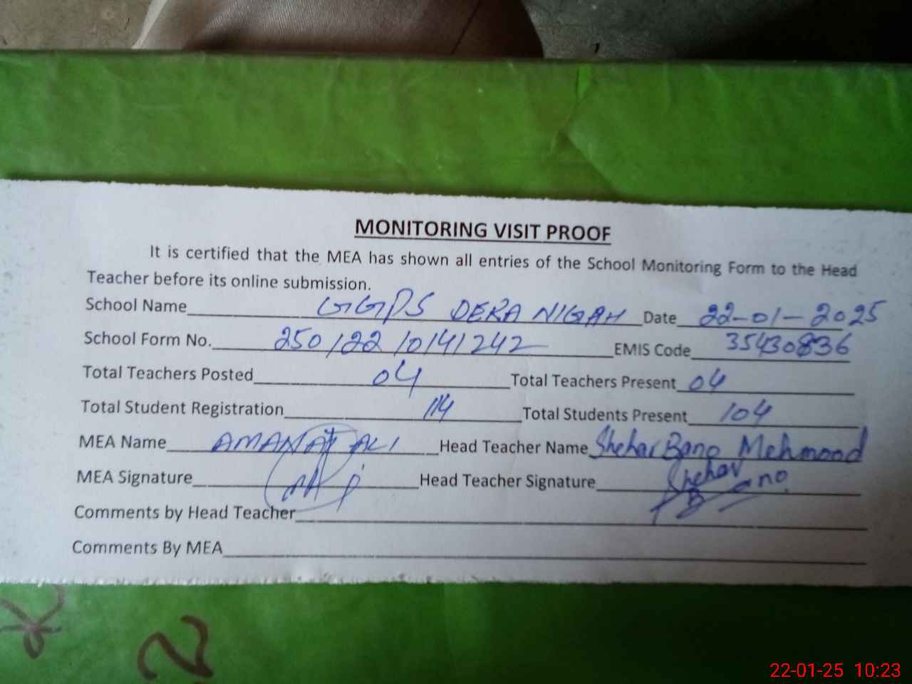| Attendance Register | Head Teacher | MEA with School | Visit Proof |