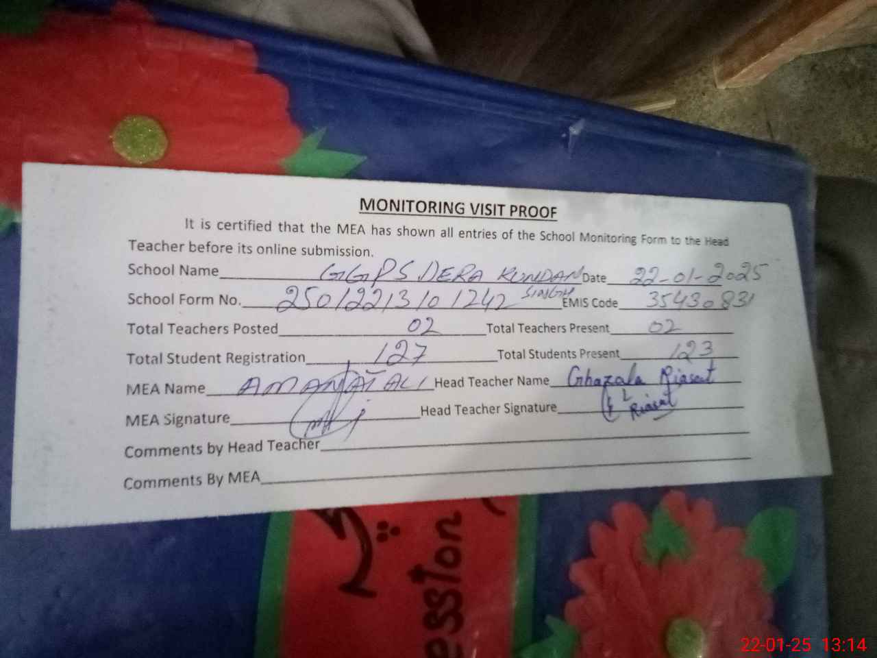 | Attendance Register | Head Teacher | MEA with School | Visit Proof |