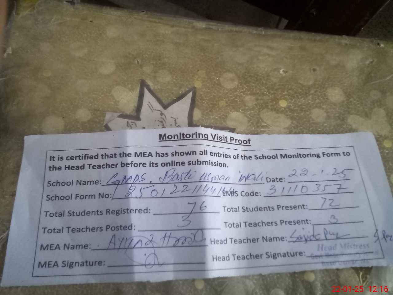 | EMIS Code: 31110357 | Name of School: GMPS BASTI USMAN WALI | |||