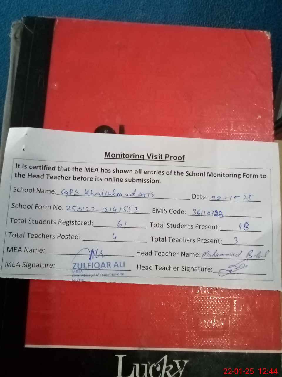 | Attendance Register | Head Teacher | MEA with School | Visit Proof |