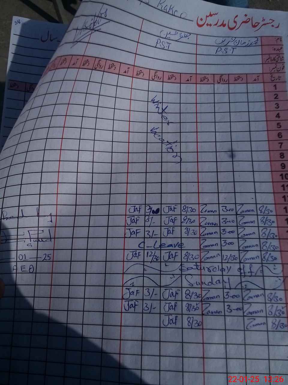 | CNIC | Full Name | Designation | R/C | Absence During Last Calender Month |