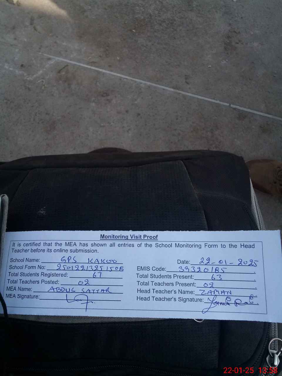 | Attendance Register | Head Teacher | MEA with School | Visit Proof |