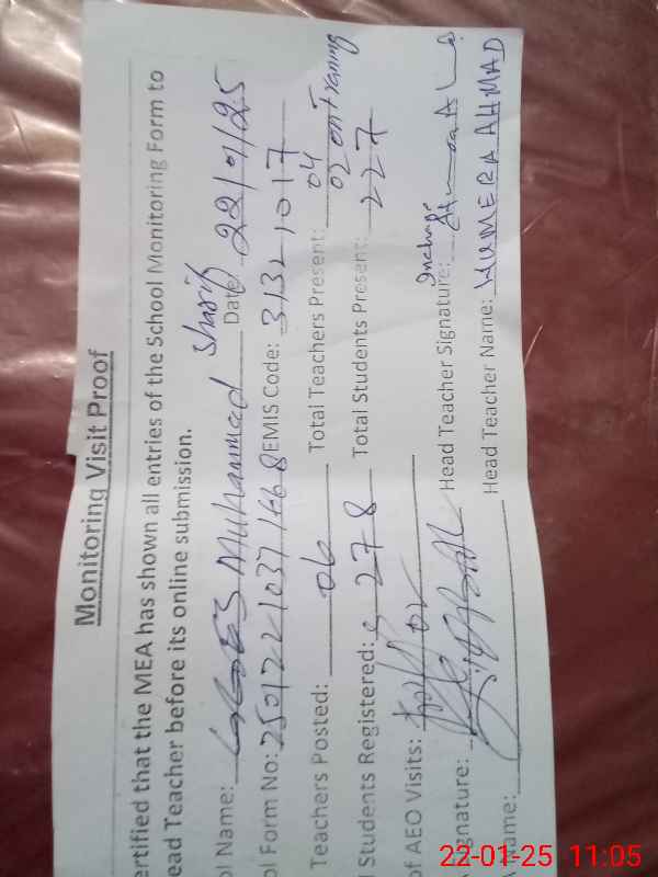 | Attendance Register | Head Teacher | MEA with School | Visit Proof |