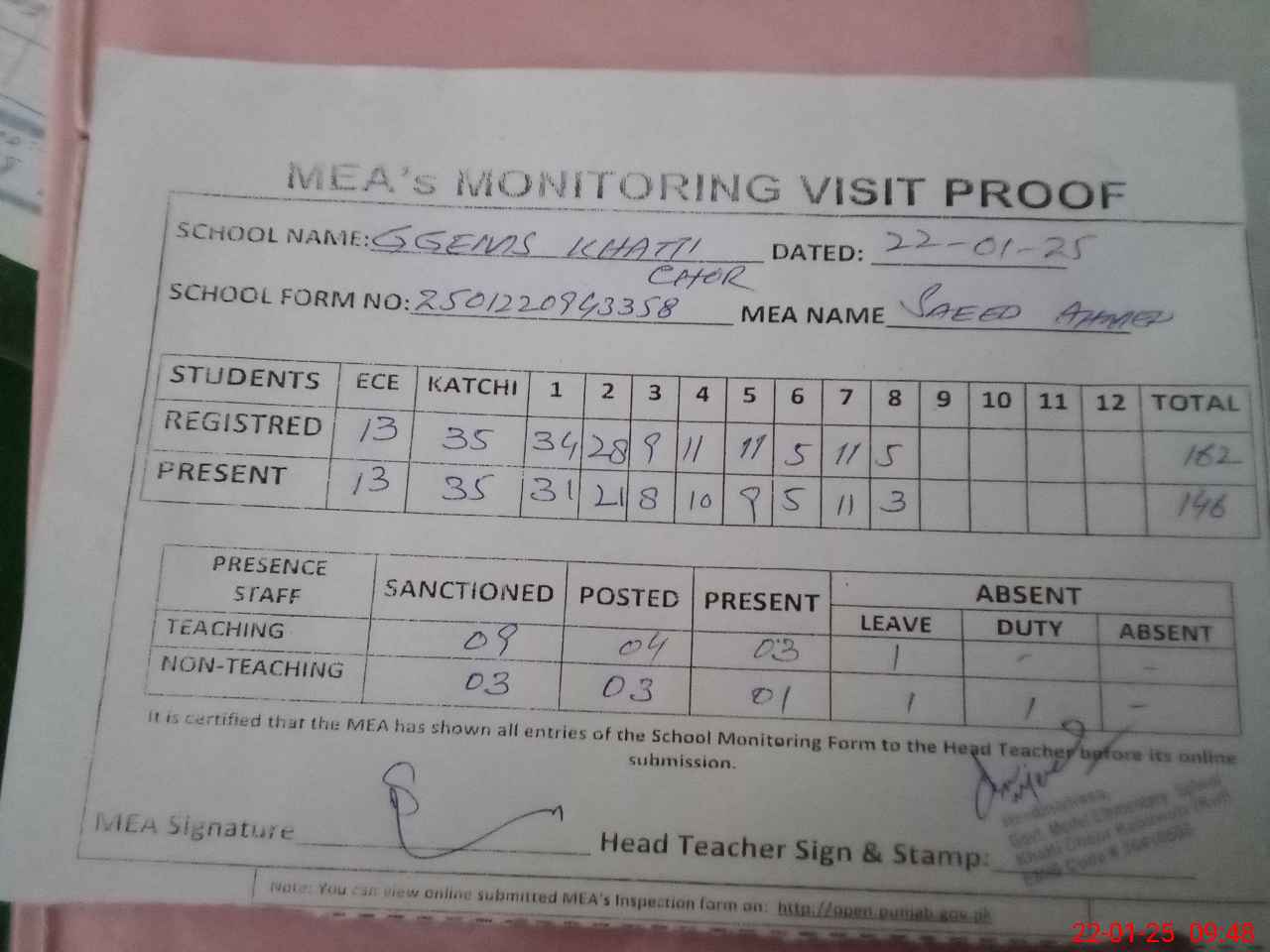 | Attendance Register | Head Teacher | MEA with School | Visit Proof |