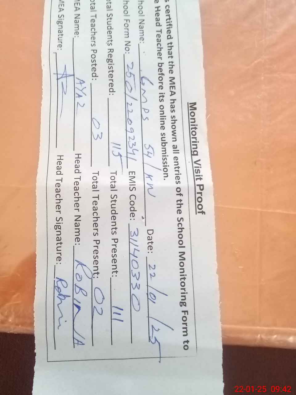 | Attendance Register | Head Teacher | MEA with School | Visit Proof |
