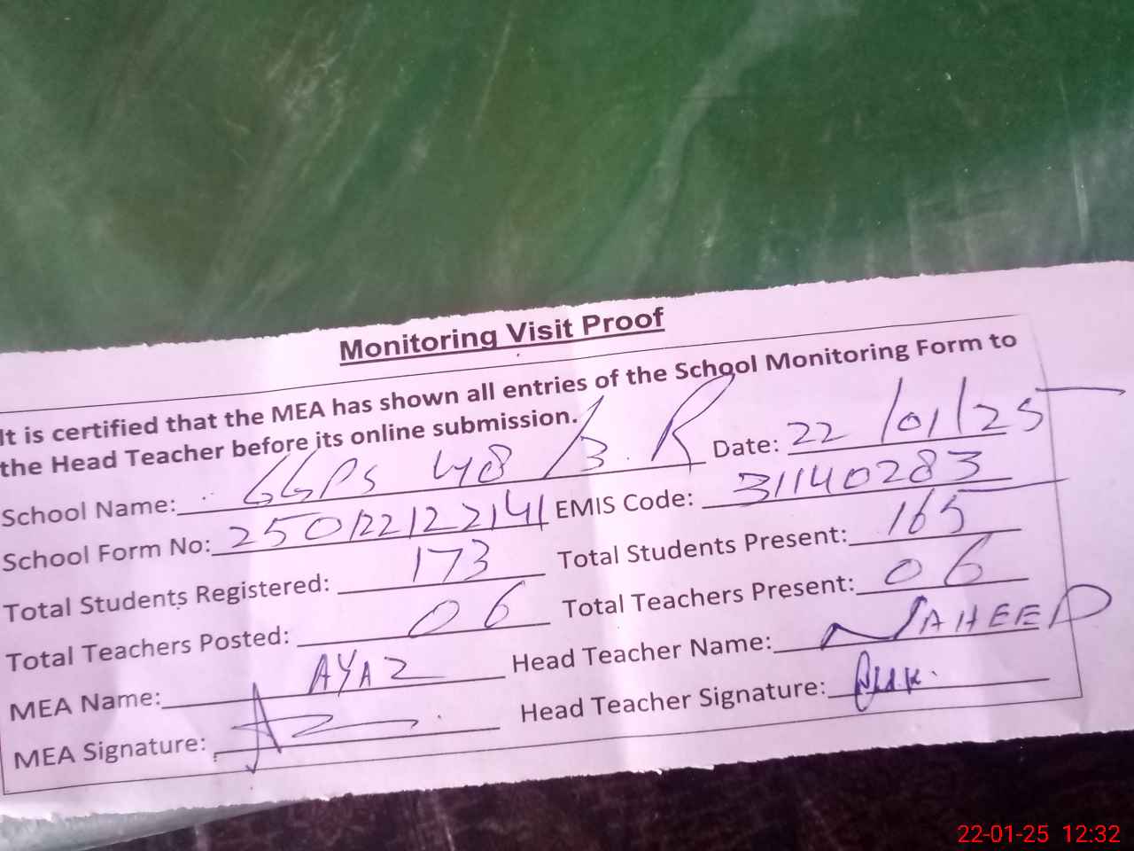 | Attendance Register | Head Teacher | MEA with School | Visit Proof |