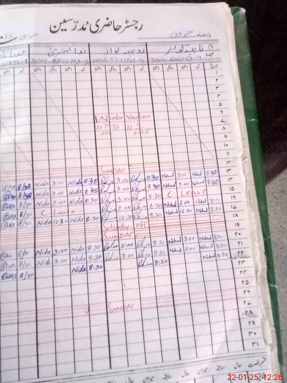 | CNIC | Full Name | Designation | R/C | Absence During Last Calender Month |