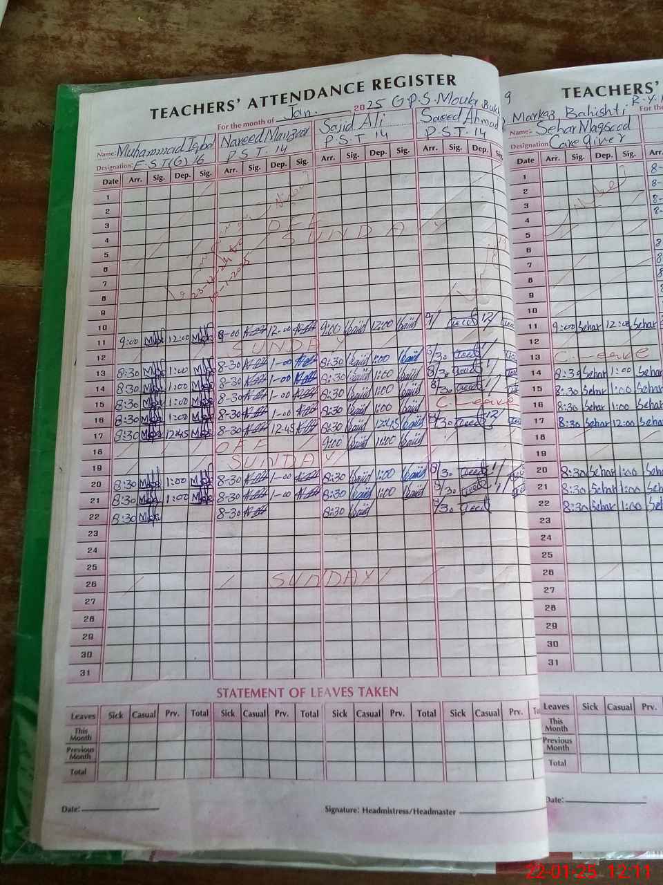 | CNIC | Full Name | Designation | R/C | Absence During Last Calender Month |