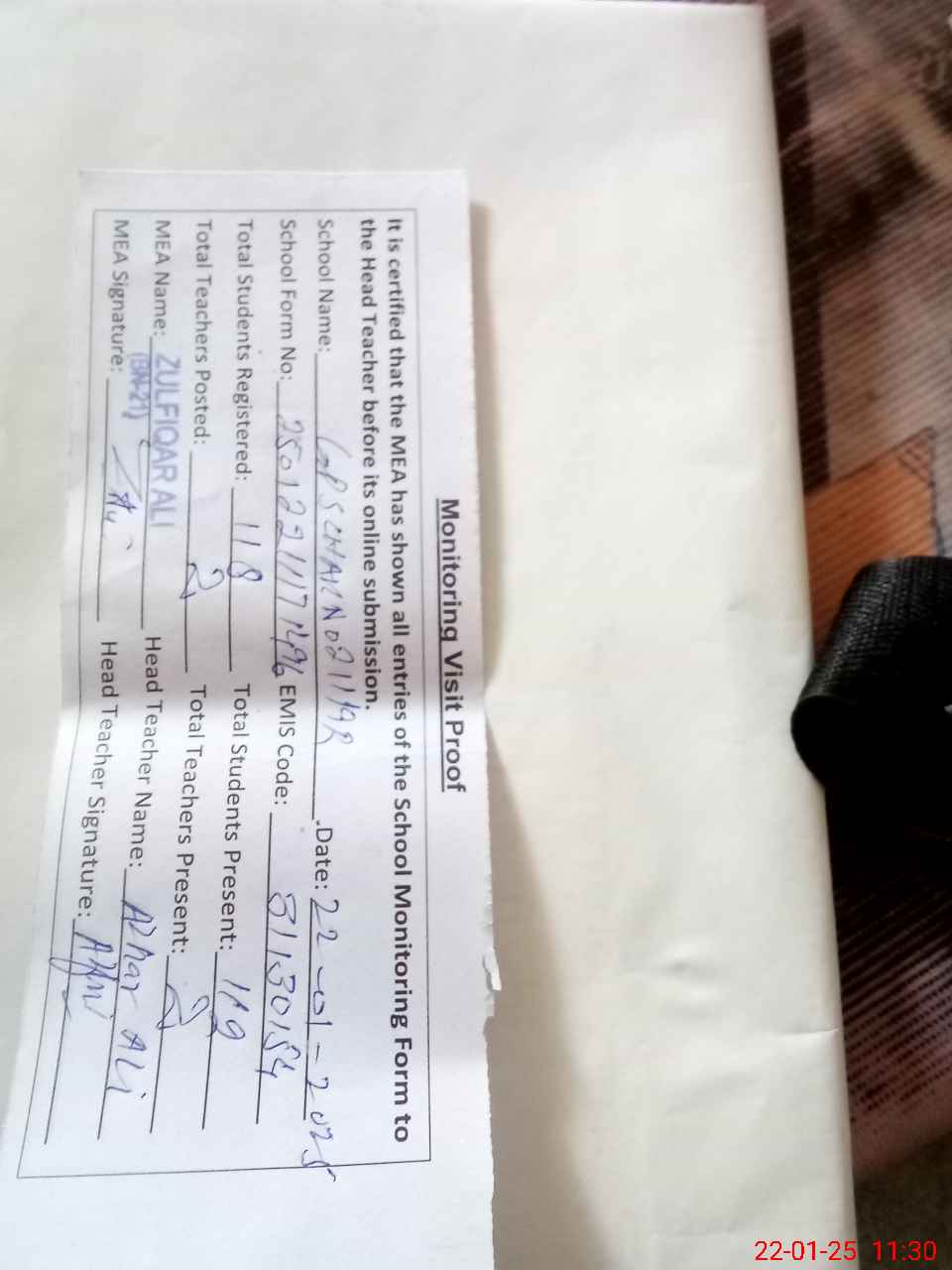| Attendance Register | Head Teacher | MEA with School | Visit Proof |