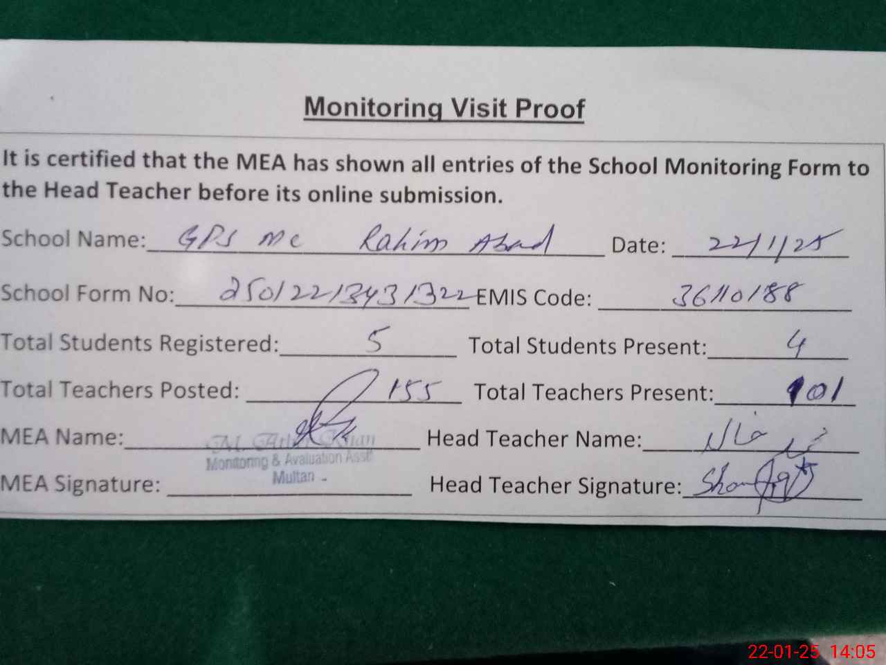 | Attendance Register | Head Teacher | MEA with School | Visit Proof |
