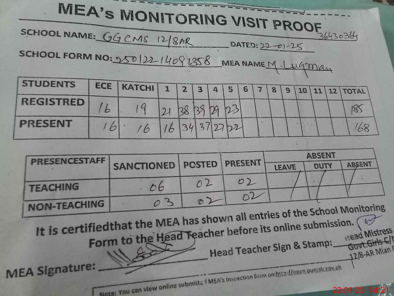 | Attendance Register | Head Teacher | MEA with School | Visit Proof |