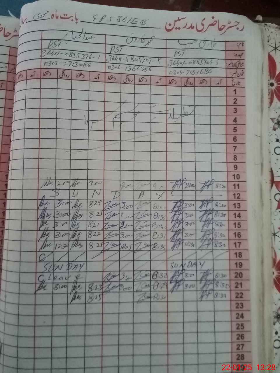| CNIC | Full Name | Designation | R/C | Absence during last cal. month |