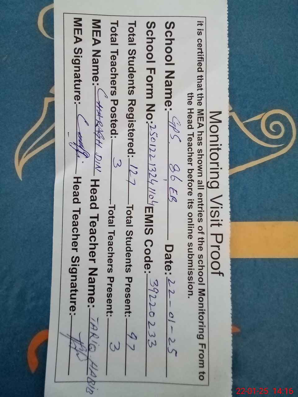 | Attendance Register | Head Teacher | MEA with School | Visit Proof |