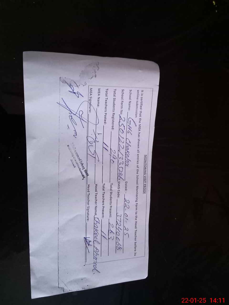 | Attendance Register | Head Teacher | MEA with School | Visit Proof |