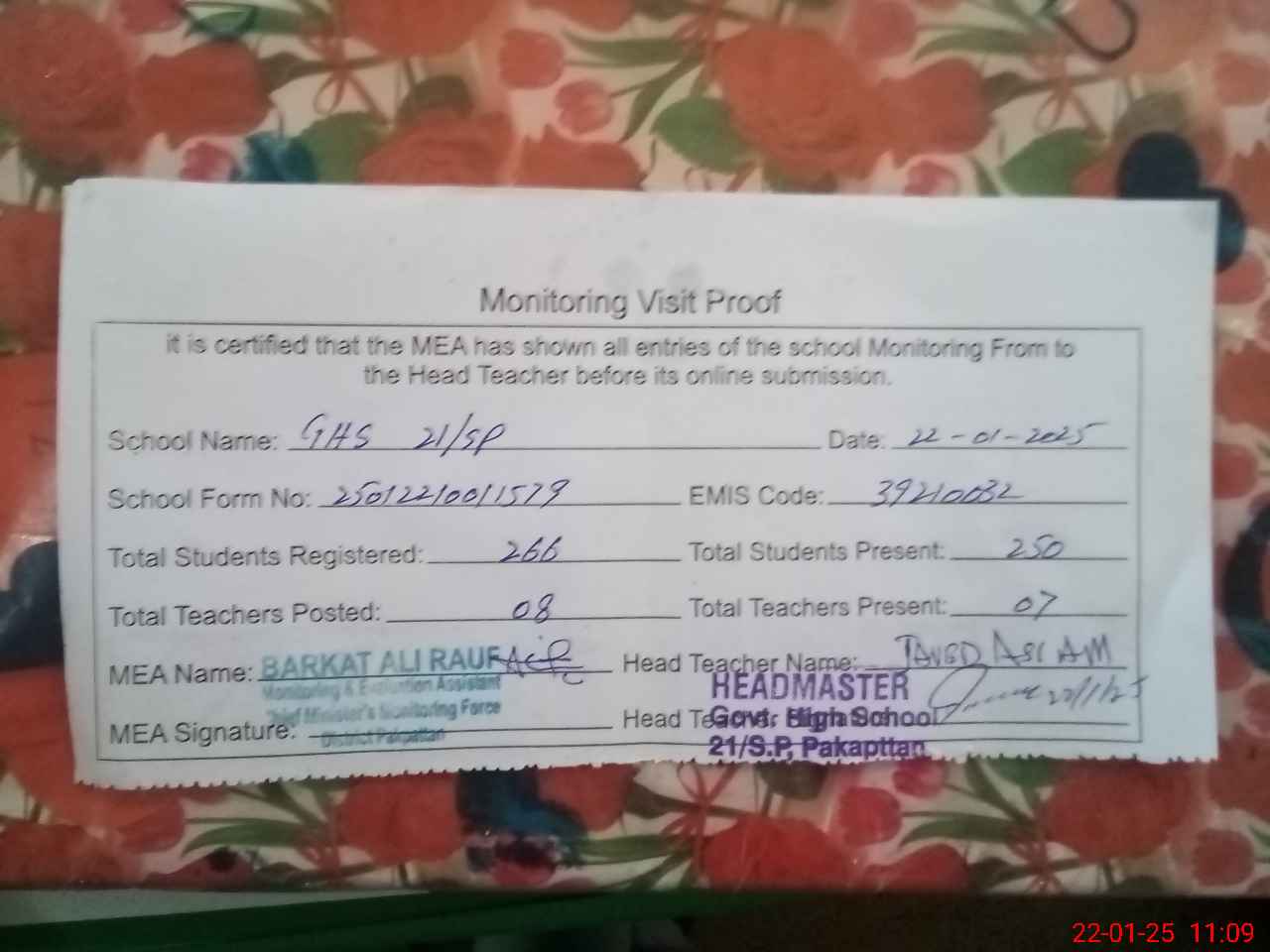 | Name: JA**** AS**** Designation: (School Headmaster's/Headmistress's) SST GENERAL Phone/Cell Number: 03**** |