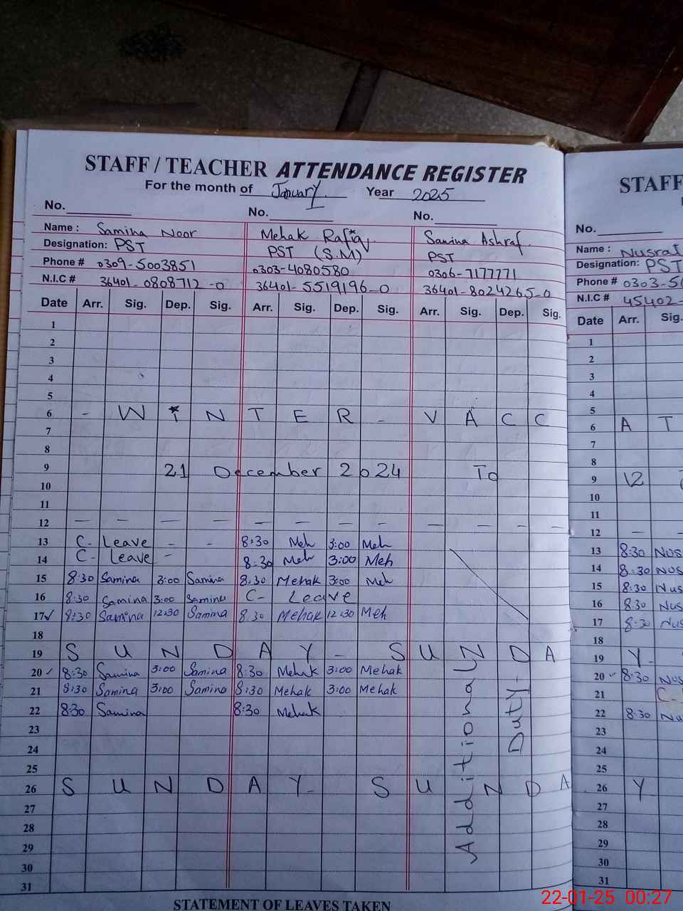 | CNIC | Full Name | Designation | R/C | Absence During Last Calender Month |