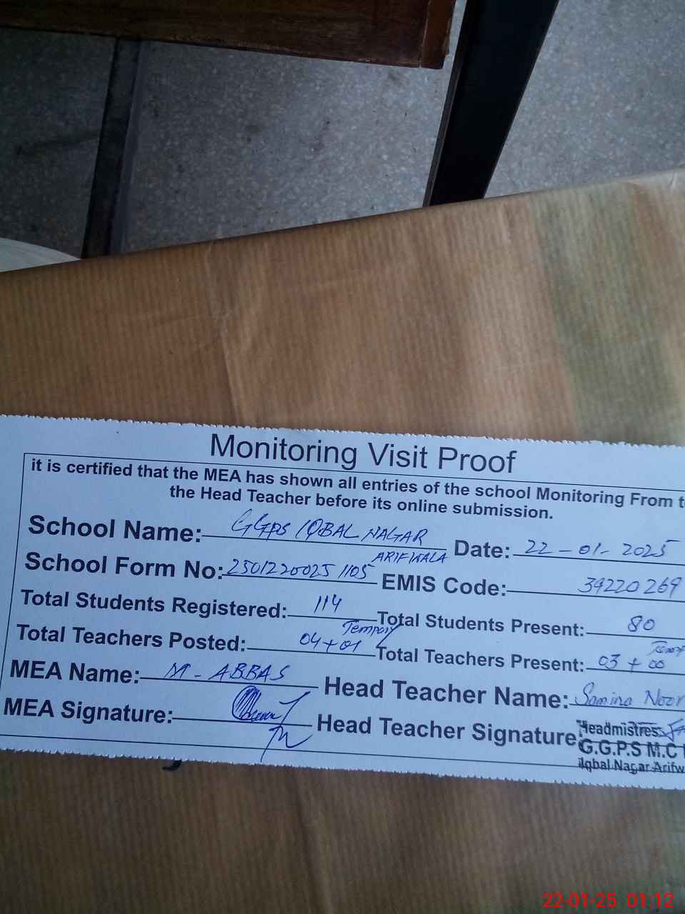 | Attendance Register | Head Teacher | MEA with School | Visit Proof |