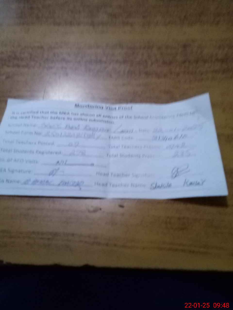 | Attendance Register | Head Teacher | MEA with School | Visit Proof |