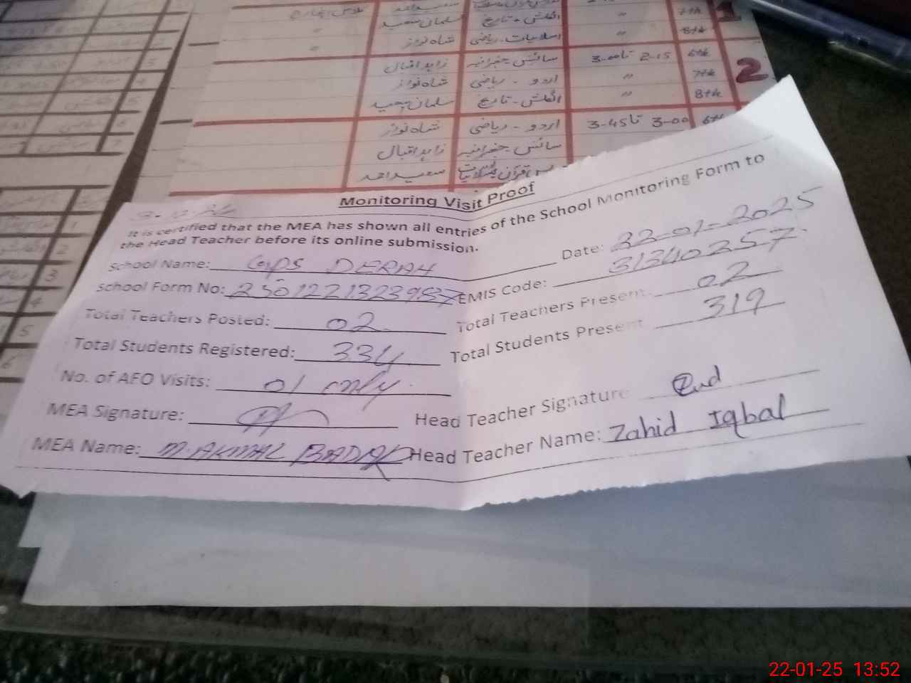 | Attendance Register | Head Teacher | MEA with School | Visit Proof |