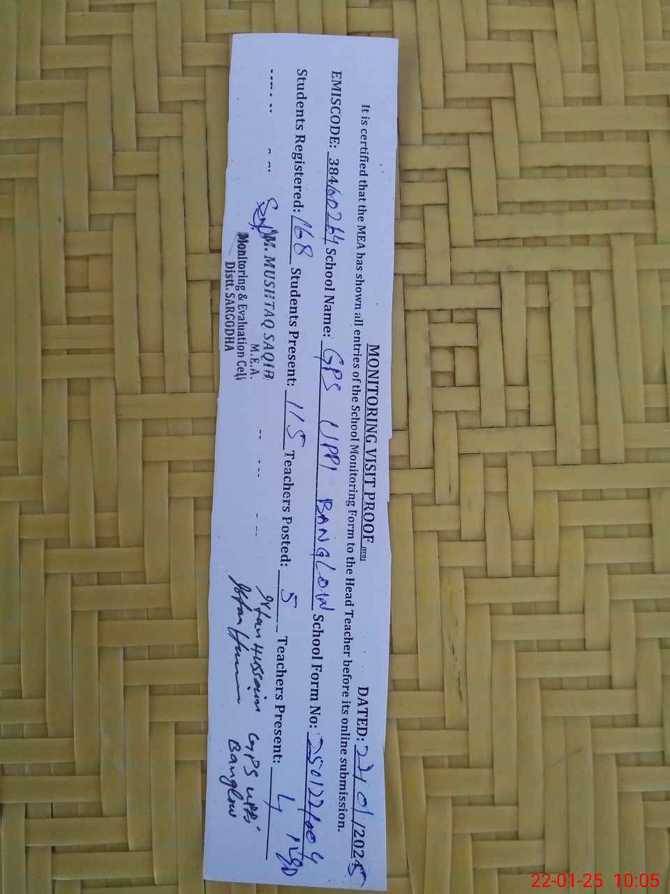 | Certified that this School was Inspected by the Undersigned MEA/DMO Today and the Information Stated Above is as Per Record. | |||||