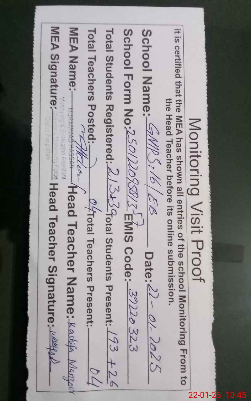 | Attendance Register | Head Teacher | MEA with School | Visit Proof |