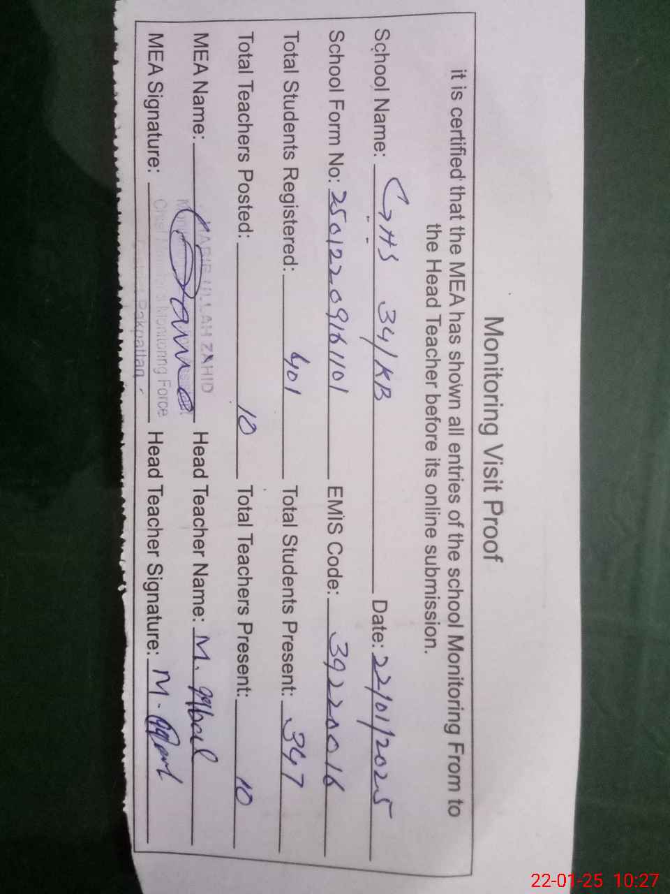 | EMIS Code: 39220016 | Name of School: GHS CHAK NO.34/KB | |||