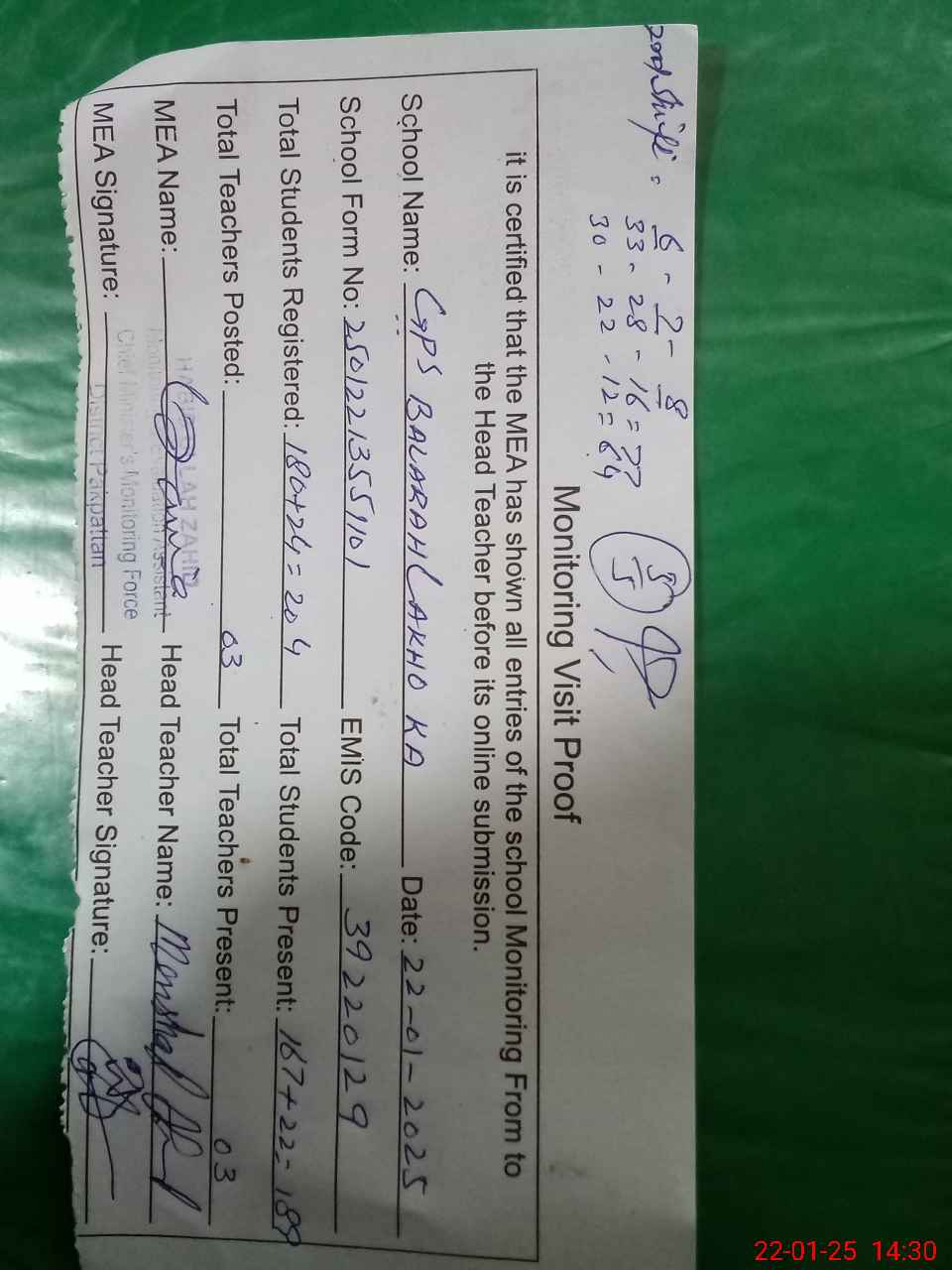| Attendance Register | Head Teacher | MEA with School | Visit Proof |