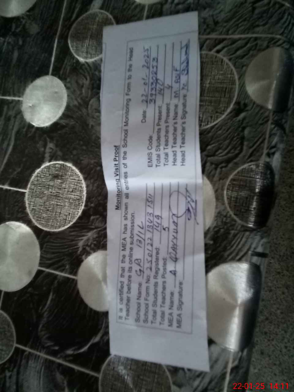 | Attendance Register | Head Teacher | MEA with School | Visit Proof |