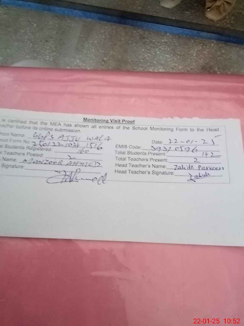 | Attendance Register | Head Teacher | MEA with School | Visit Proof |