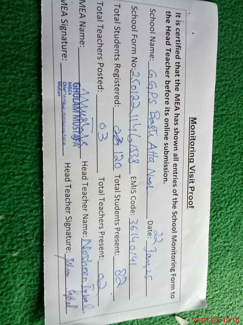 | Attendance Register | Head Teacher | MEA with School | Visit Proof |
