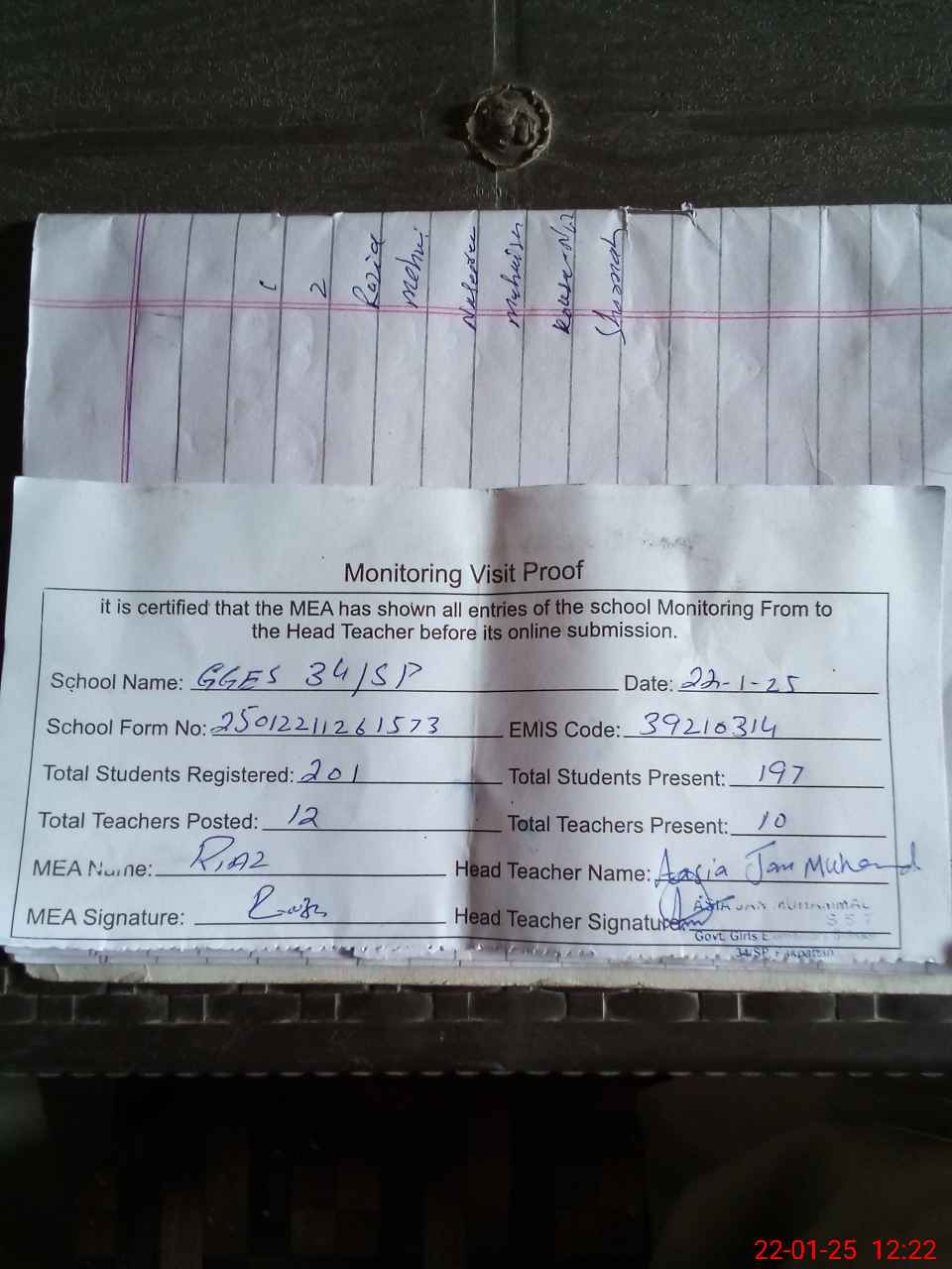 | Attendance Register | Head Teacher | MEA with School | Visit Proof |