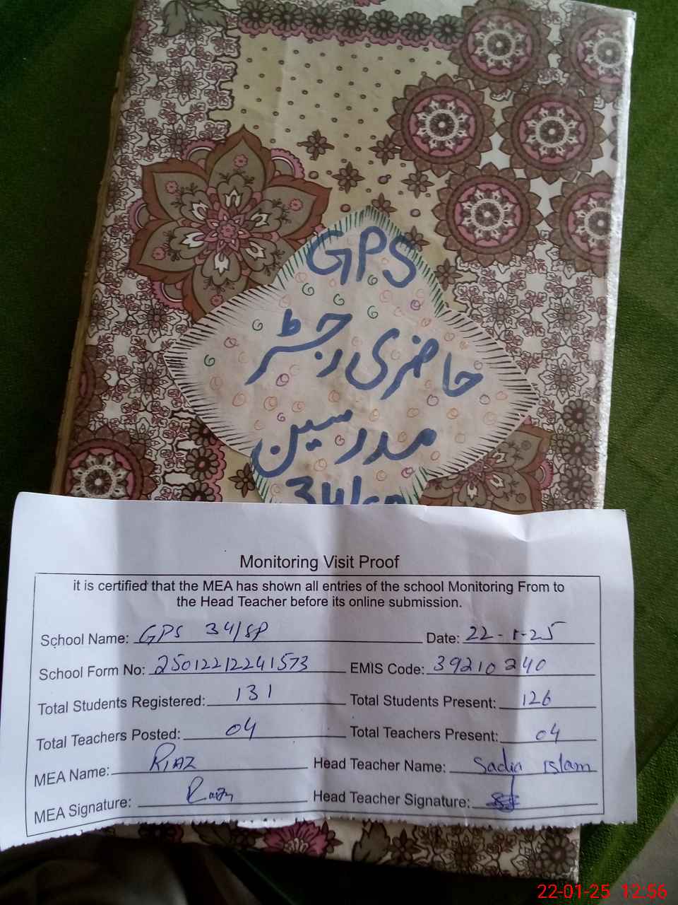 | EMIS Code: 39210240 | Name of School: GPS CHAK NO. 34 SP | |||