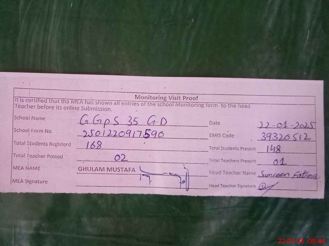 | Remarks (Use Separate Page if Required): GGPS 35 GD visited and found maintained except water supply line found unserviceable due to its theft by the theves etc | |||||
