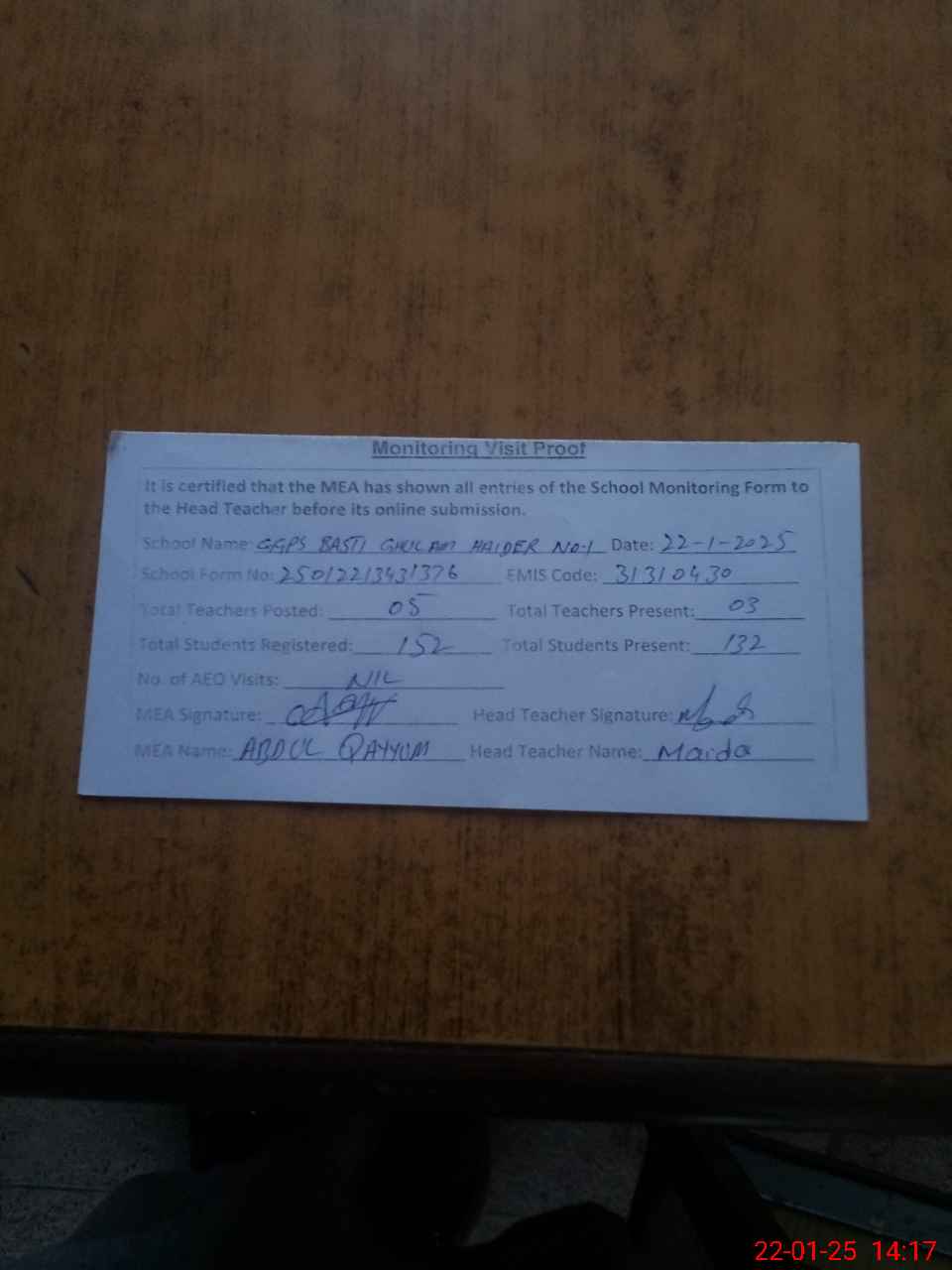 | Attendance Register | Head Teacher | MEA with School | Visit Proof |