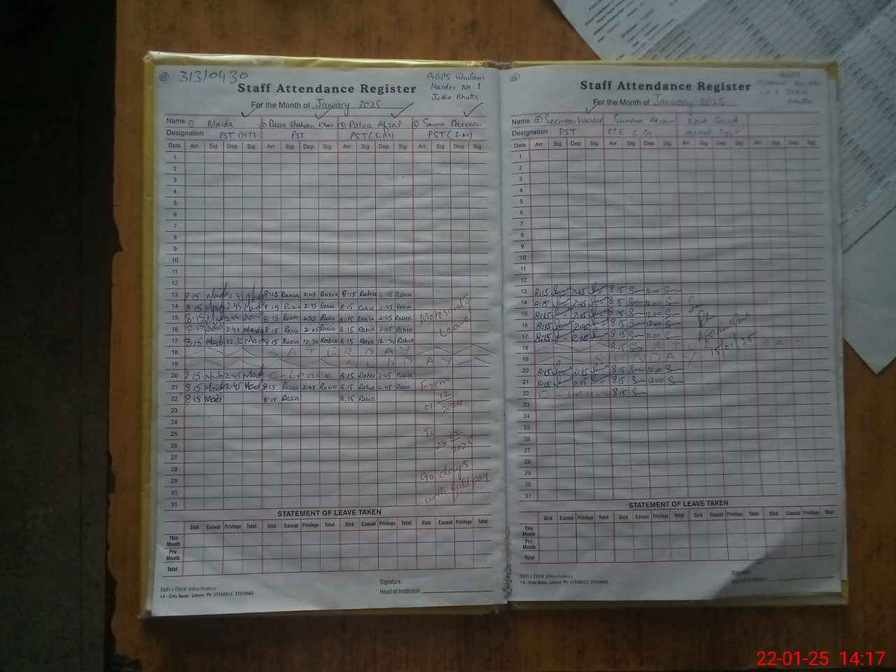| CNIC | Full Name | Designation | R/C | Absence During Last Calender Month |