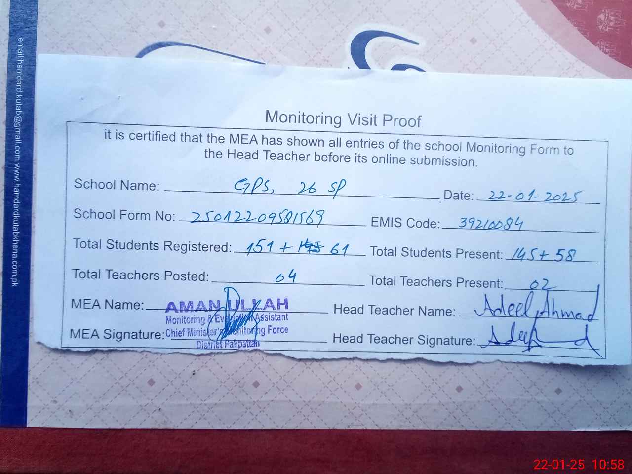 | EMIS Code: 39210084 | Name of School: GPS 26/SP PAKPATTAN | |||