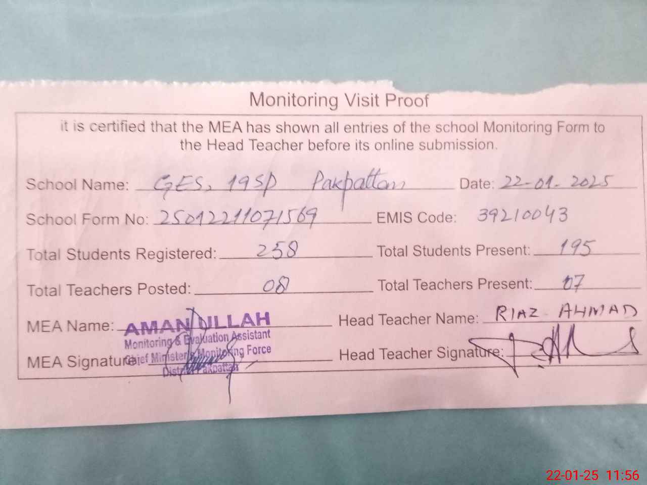 | Attendance Register | Head Teacher | MEA with School | Visit Proof |