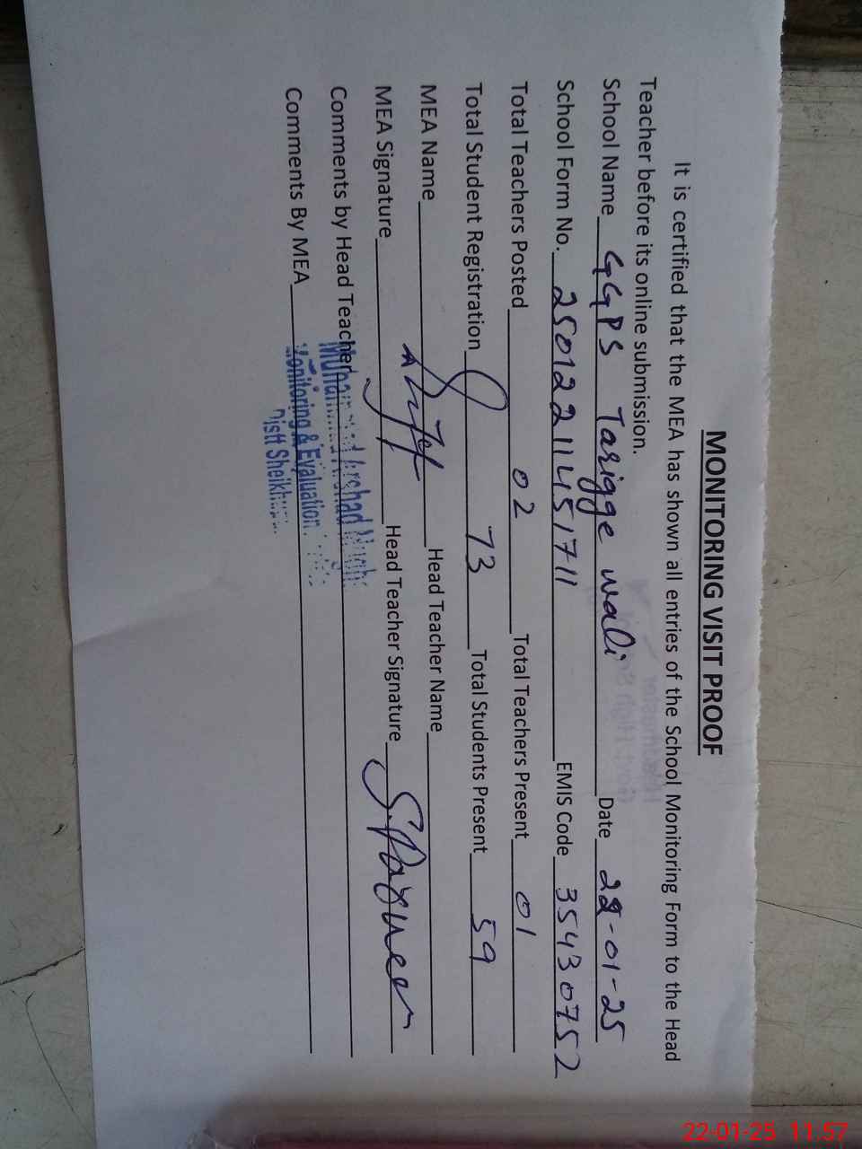 | Attendance Register | Head Teacher | MEA with School | Visit Proof |